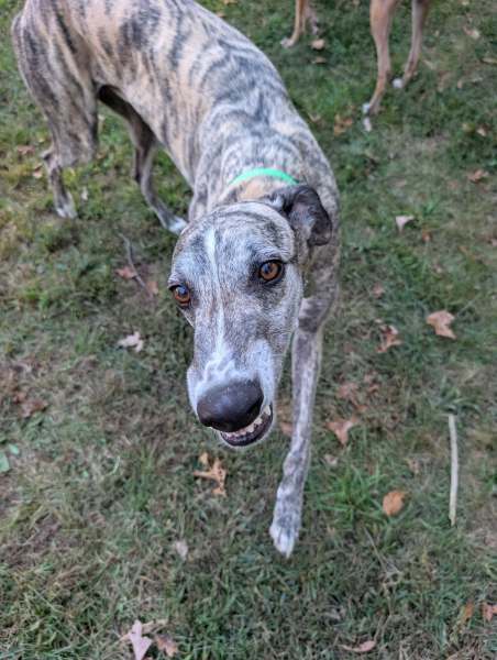 Silver is a big handsome boy who just turned 5 and had a successful racing career of 147 starts and now he’s ready to find his forever family. He’s a gentle giant and is always super excited to greet you with more smiles than a kid on Christmas morning (see his picture below showing his teeth – that’s a greyhound SMILE). He settles quickly and will stay by your side soaking up all of the love you can give. He has adjusted flawlessly with two other fosters and the resident pack of greys as well as a Chihuahua. He also passed our preliminary cat test!